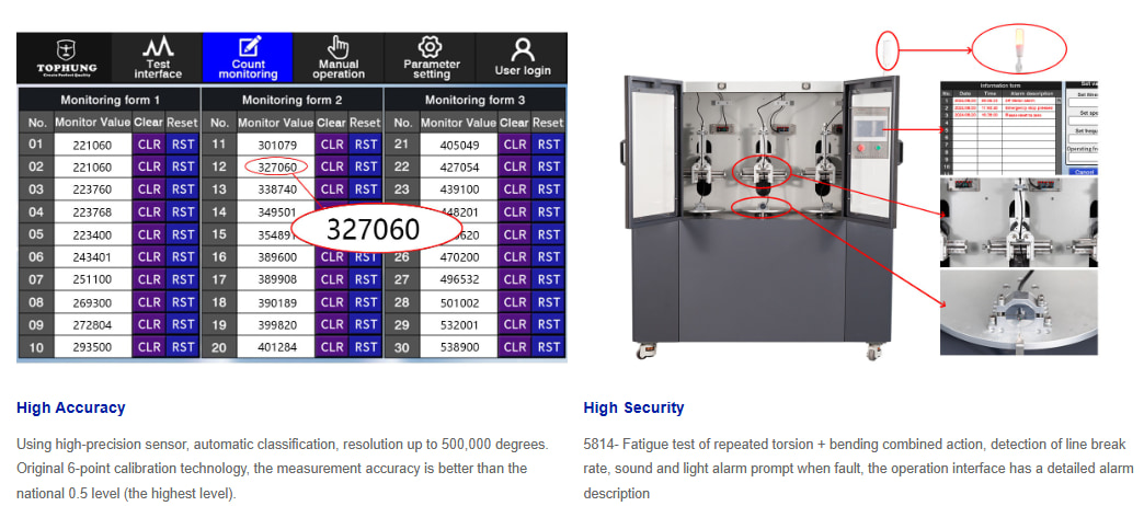 La serie TH-5814 está diseñada con un diseño único Estructura combinada de torsión y flexión compuestaA diferencia de los probadores tradicionales, esta máquina fija el extremo superior de la muestra de cable a un dispositivo de doblado, mientras que el extremo inferior se asegura a una plataforma giratoria.